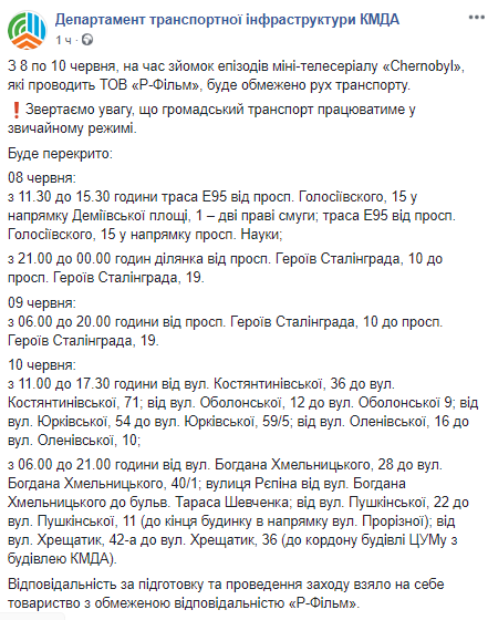 С 8 по 10 июня в центре Киева и еще в двух районах перекроют несколько улиц из-за съемок сериала о Чернобыле. Об этом в соцсети сообщила пресс-служба Департамента транспортной инфраструктуры.