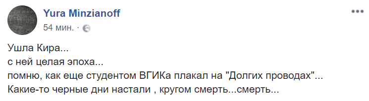 "Ушла Кира... с ней целая эпоха... Помню, как еще студентом ВГИКа плакал на "Долгих проводах"... Какие-то черные дни настали , кругом смерть...смерть...", – пишет в Facebook телепродюсер Юрий Минзянов.