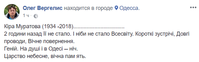 "Кира Муратова (1934-2018). 2 часа назад ее не стало. Будто не стало Вселенной. Короткие встречи, долгие проводы, вечное возвращение. Гений. На душе и в Одессе – ночь. Царство небесное, вечная память", – написал украинский театральный критик Олег Вергелис на своей странице в "Фейсбук" в среду вечером.