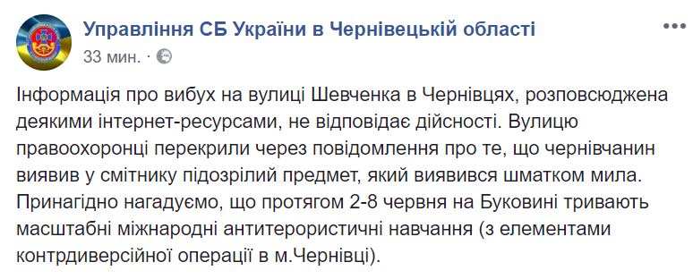 "Информация о взрыве на улице Шевченко в Черновцах не соответствует действительности. Улицу правоохранители перекрыли из-за сообщения о том, что житель Черновцов обнаружил в помойке подозрительный предмет, который оказался куском мыла. Напоминаем, что в течение 2-8 июня на Буковине продолжаются масштабные международные антитеррористические учения (с элементами контрдиверсионные операции в г.Черновцы)", - говорится в сообщении.
