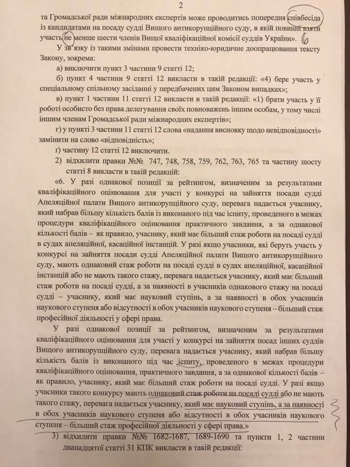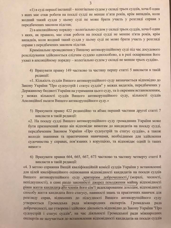 "Окончательная редакция закона об Анткорупционном суде. Если международные эксперты (трое из шести) признали судью нечестным, то вето может быть преодолено на СОВМЕСТНОМ заседании Совета международных экспертов и Высшей квалификационной комиссии судей при УСЛОВИИ, что трое из шести международных экспертов поддержат преодоление вето", - пишет Лещенко.