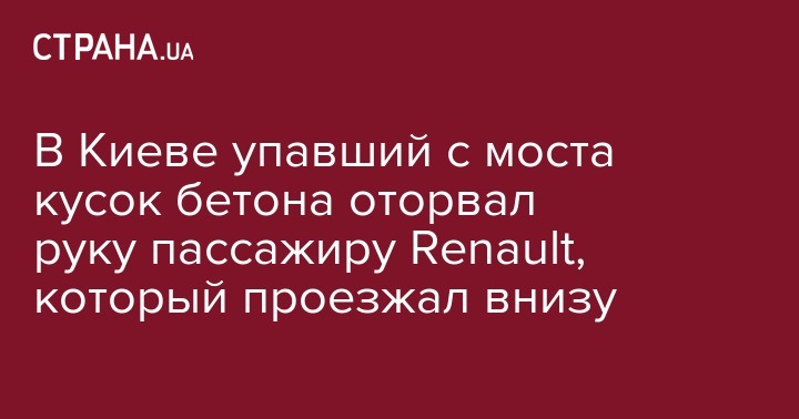 "У станции метро Берестейской от путепровода отвалился или кто-то бросил (пока непонятно) огромный кусок бетона и упал на проезжающий мимо автомобиль Renault.  Увы, пострадал пассажир авто, его госпитализировали с серьезной травмой руки (практически оторвало)", - говорится в сообщении.