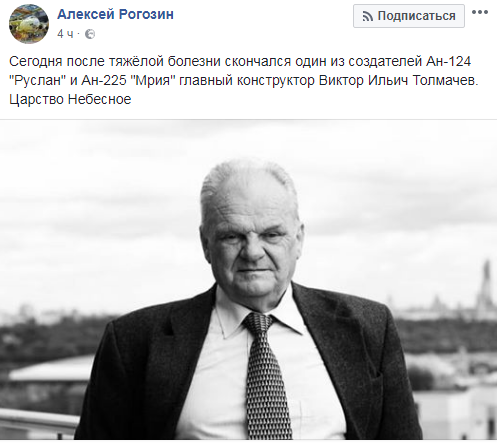 Советский авиаконструктор, разработчик самолетов Ан-124 "Руслан" и Ан-225 "Мрия" Виктор Толмачев скончался после тяжелой болезни. Ему было 83 года.