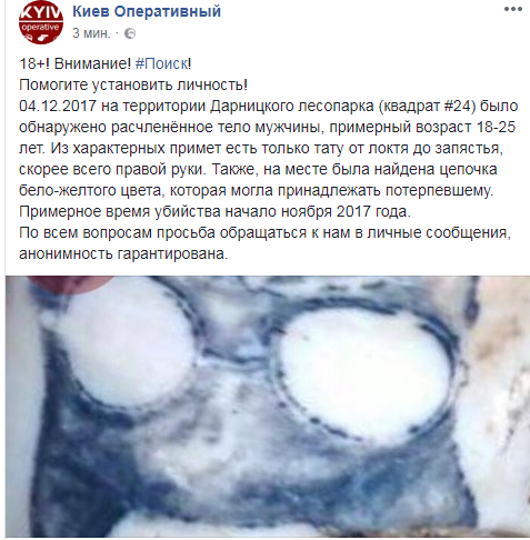 04.12.2017 на территории Дарницкого лесопарка (квадрат #24) было обнаружено расчленённое тело мужчины, примерный возраст 18-25 лет. Из характерных примет есть только тату от локтя до запястья, скорее всего правой руки. Также, на месте была найдена цепочка бело-желтого цвета, которая могла принадлежать потерпевшему.