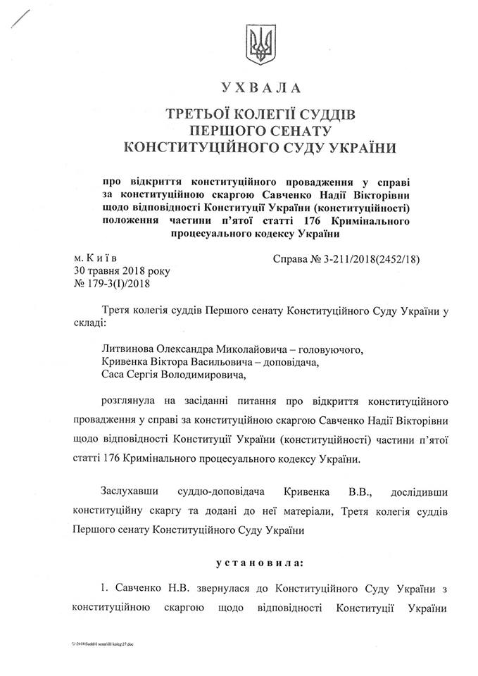 Конституционный суд открыл производство по конституционной жалобе Надежды Савченко.