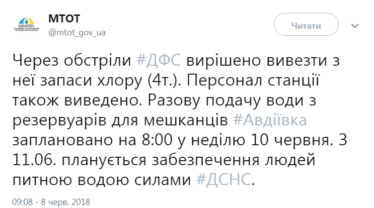 Донецкая фильтровальная станция была обесточена 6 июня вечером из-за повреждения воздушной линии электропередачи 110 кВ "Макеевка - АКХЗ-2" (на временно неподконтрольной территории) в результате боевых действий. В связи с остановкой ДФС было прекращено водоснабжение Авдеевки. Техническую воду населению города 9 июня будут подвозить автоцистернами, а резерва питьевой воды ориентировочно хватит на 4 суток.