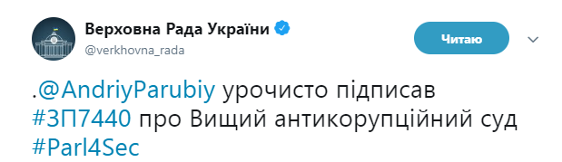 Спикер Верховной Рады Андрей Парубий подписал закон о Высшем антикоррупционном суде.