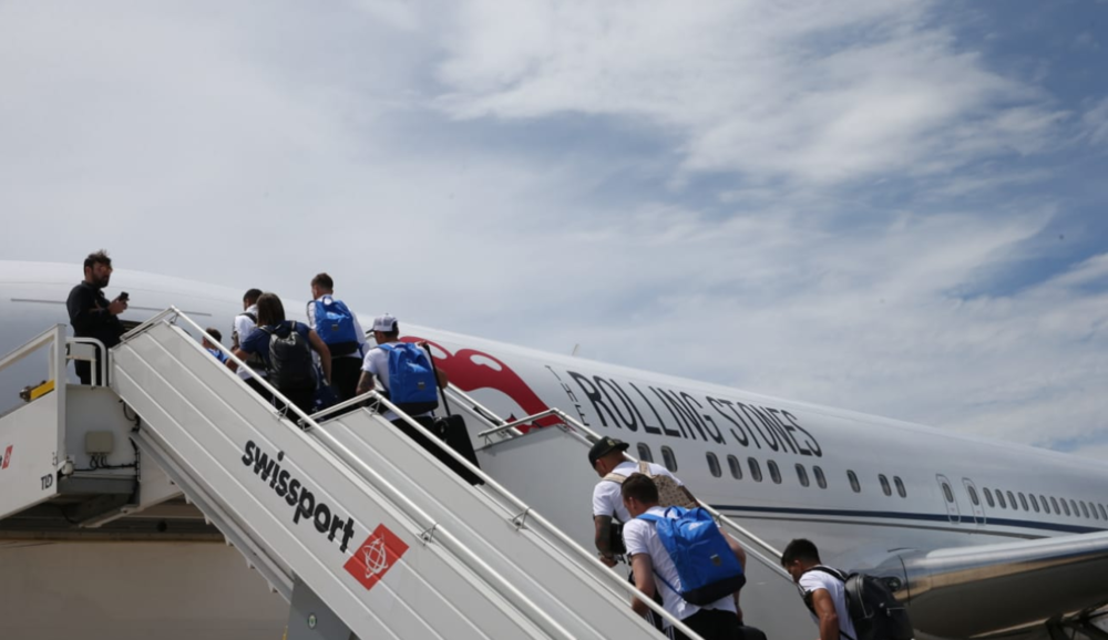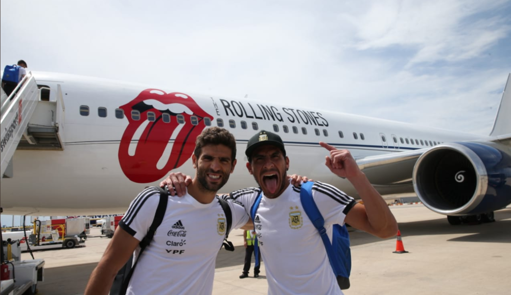 "Альби селесте" отправились на турнир на лайнере, украшенном символикой великой рок-группы The Rolling Stones.