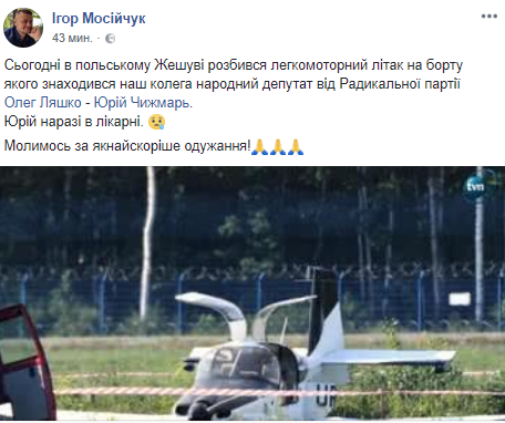 "Сегодня в польском Жешуве разбился легкомоторный самолет, на борту которого находился наш коллега, народный депутат от Радикальной партии Олега Ляшко – Юрий Чижмарь. Юрий сейчас в больнице", – написал Игорь Мосийчук.