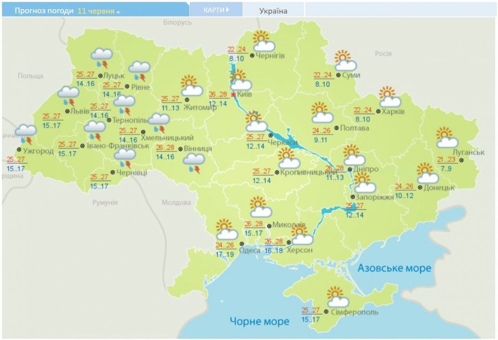 Во вторник, 12 июня, грозовой фронт распространится дальше по стране. Сухая погода будет лишь в восточных регионах, некоторых регионах юга страны и в Крыму. Температура будет также в рамках +24...+28 градусов.