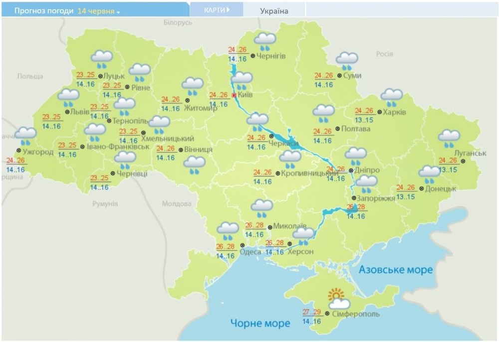В среду, 13 июня, дожди будут лишь в центральных регионах. На остальной территории будет сухо и тепло. Температура ожидается +24...+26 тепла, местами до +27.