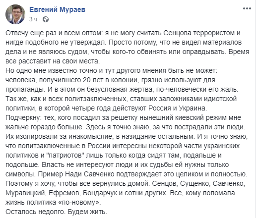 "Отвечу еще раз и всем оптом: я не могу считать Сенцова террористом и нигде подобного не утверждал. Просто потому, что не видел материалов дела и не являюсь судом, чтобы кого-то обвинять или оправдывать. Время все расставит на свои места. Но одно мне известно точно и тут другого мнения быть не может: человека, получившего 20 лет в колонии, грязно используют для пропаганды. И в этом он безусловная жертва, по-человечески его жаль. Так же, как и всех политзаключенных, ставших заложниками идиотской политики, в которой четыре года действуют Россия и Украина. Подчеркну: тех, кого посадил за решетку "нынешний киевский режим" мне жальче гораздо больше. Здесь я точно знаю, за что пострадали эти люди. Их изолировали за инакомыслие, в назидание остальным. И я точно знаю, что политзаключенные в России интересны некоторой части украинских политиков и "патриотов" лишь только когда сидят там, подальше и подольше. Власть не интересуют люди и их судьбы - ей нужны только символы. Поэтому я хочу, чтобы все вернулись домой. Сенцов, Сущенко, Савченко, Муравицкий, Ефремов, Бондарчук и сотни других", - написал Мураев.