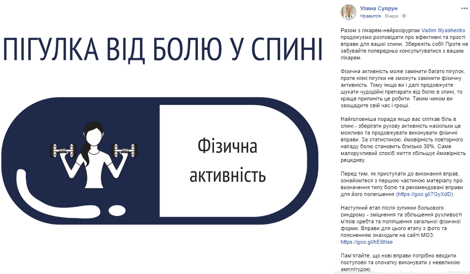 Глава Минздрава Ульяна Супрун вместе с врачом-нейрохирургом Вадимом Ильяшенко рассказала, как справляться с болью в спине. Советы она опубликовала на странице в Facebook.