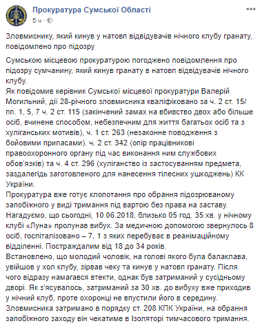 Как сообщил руководитель Сумской местной прокуратуры Валерий Могильный, действия 28-летнего злоумышленника квалифицированы по ч.2 ст.15/пп. 1,5, 7 ч.2 ст.115 (законченное покушение на убийство двух или более лиц, совершенное способом, опасным для жизни многих лиц и из хулиганских побуждений), ч.1 ст.263 (незаконное обращение с боевыми припасами). ч.2 ст.342 (сопротивление работнику правоохранительного органа при исполнении им служебных обязанностей) и ч.4 ст.296 (хулиганство с применением предмета, заранее заготовленного для нанесения телесных повреждений) УК Украины.