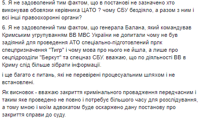 "Вчера мой адвокат Франчук Александр Николаевич получил в Главной военной прокуратуре ГПУ постановление следователя о закрытии уголовного производства по моему заявлению по сдаче Крыма… Считаю закрытие уголовного производства преждевременным, таким которое проведено не полно и требует большего времени для расследования, а потому мной и моим адвокатом данное постановление о закрытии дела будет обжаловано в суде… В меру предоставленных законом прав мы будем продолжать в этом направлении свою работу по установлению истины и возможности точной квалификации деятельности большого количества чиновников", - говорится в заявлении Дисяка.