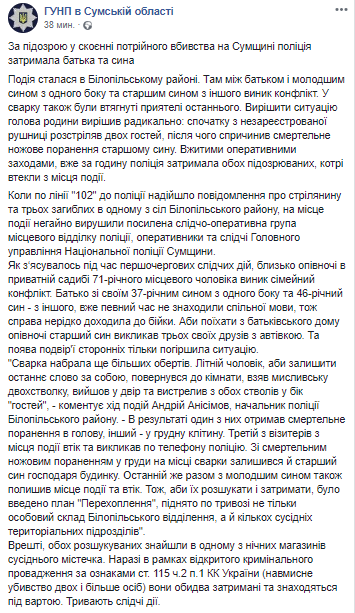 В Сумской области во время ссоры отец зарезал своего старшего сына и застрелил двух его приятелей. Об этом в Facebook сообщает пресс-служба полиции Сумщины.