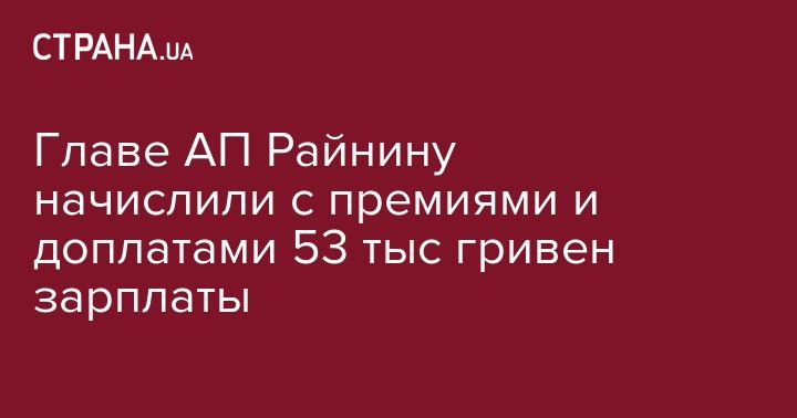 Заработная плата главы Администрации Президента Игоря Райнина за май составила 53 167 гривен. Об этом пишут Українські Новини со ссылкой на Государственное управление делами .