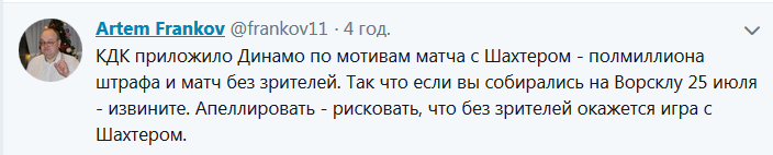 За такое поведение КДК ФФУ оштрафовал столичный клуб на 500 тысяч гривен. Кроме того, "Динамо" проведет один матч при пустых трибунах, сообщает экс-член исполкома ФФУ Артем Франков в своем Twitter.