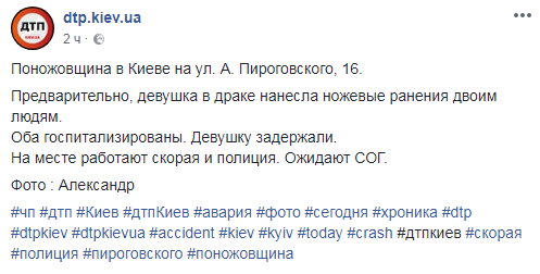 Согласно предварительной информации, девушка в драке нанесла ножевые ранения двоим людям. Их обоих госпитализировали.