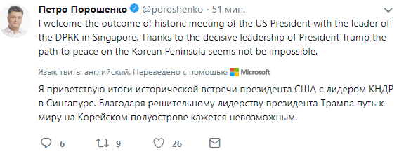 "Надеюсь, что гарантии безопасности со стороны США в связи с денуклеаризацией полуострова учтут недостатки Будапештского меморандума относительно гарантий безопасности Украины", - добавил Порошенко.
