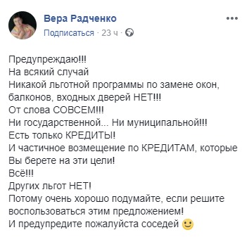 "Предупреждаю! На всякий случай. Никакой льготной программы по замене окон, балконов, входных дверей нет! От слова "совсем". Ни государственной, ни муниципальной! Есть только кредиты! И частичное возмещение по кредитам, которые вы берете на эти цели! Все! Других льгот нет! Потому очень хорошо подумайте, если решите воспользоваться этим предложением! И предупредите, пожалуйста, соседей", – написала Радченко.
