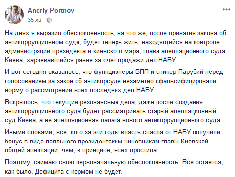 "На днях я выразил обеспокоенность, на что же, после принятия закона об Антикоррупционном суде, будет теперь жить, находящийся на контроле администрации президента и киевского мэра, глава апелляционного суда Киева, харчевавшийся ранее за счет продажи дел НАБУ.