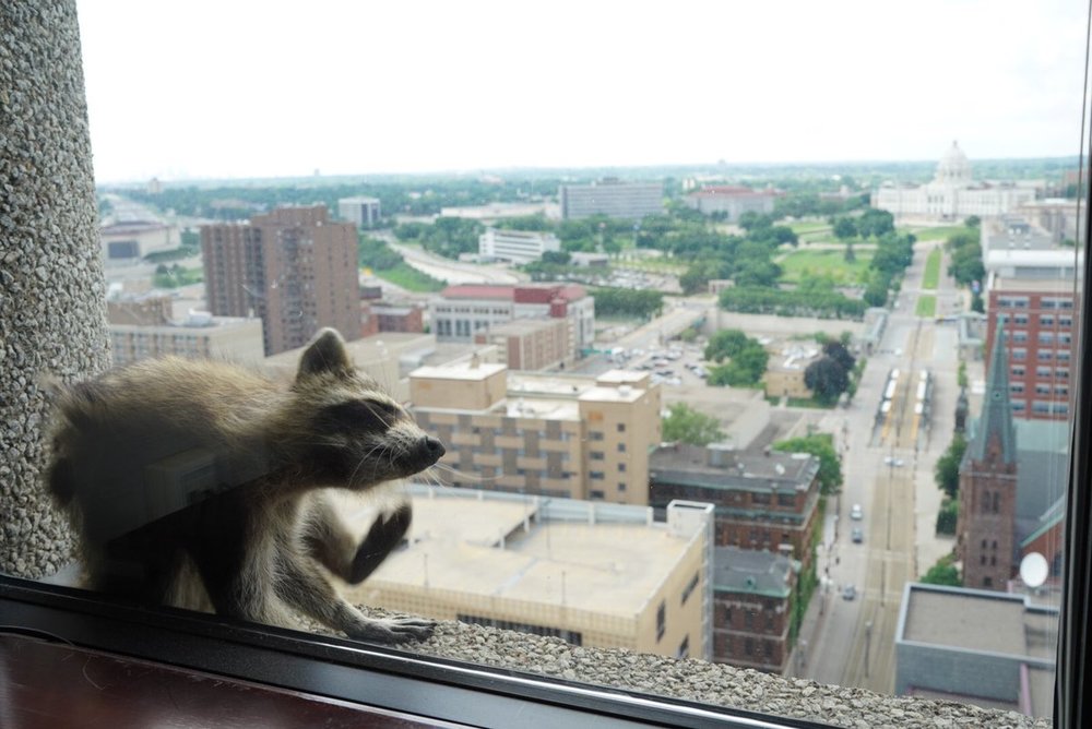 Енот забрался на крышу небоскреба в Миннесоте и стал звездой соцсетей. Видео