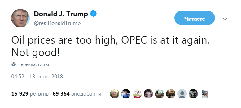 "Цены на нефть слишком высокие, ОПЕК снова взялась за свое. Нехорошо!" - написал в Twitter глава Белого дома.