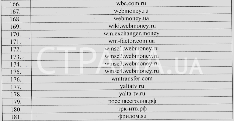В документе присутствуют сайты "ДНР" и "ЛНР", официальные веб-странички крымских властей, многие российские информационные агентства, а также все поддомены платежного сервиса Webmoney.