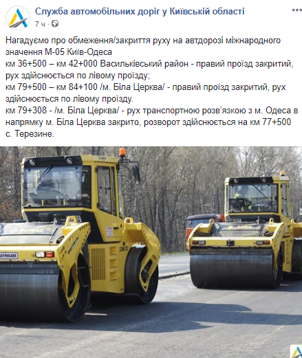 В сообщении напоминается об ограничении / закрытии движения на автодороге международного значения М-05 Киев-Одесса: