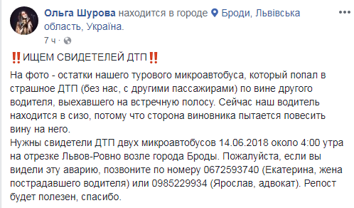 "На фото - остатки нашего турового микроавтобуса, который попал в страшное ДТП (без нас, с другими пассажирами) по вине другого водителя, который выехал на встречную полосу. Сейчас наш водитель находится в СИЗО, потому что сторона виновника пытается повесить вину на него", - сообщила Ольга Шурова.