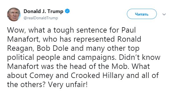 "Вау, что за жесткое решение для Пола Манафорта, который представлял Рональда Рейгана, Боба Доула и многих других ведущих политиков и кампаний. Я и не знал, что Манафорт главарь мафии. А что насчет Коми (бывшего главы ФБР Джеймса Коми - Прим. Ред.) и продажной Хиллари (Хиллари Клинтон, оппонента Трампа на выборах - Прим. Ред.), и всех других? Очень нечестно!" - написал он.