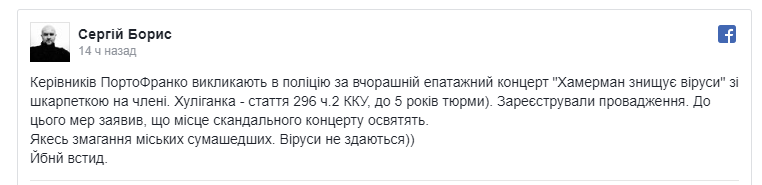 "Руководителей ПортоФранко вызывают в полицию за вчерашний эпатажный концерт "ХЗВ" с носком на члене. Хулиганка - статья 296 ч.2 УК, до 5 лет тюрьмы. Зарегистрировали производства. К тому же мэр заявил, что место скандального концерта освятят. Некое соревнование городских сумасшедших. Вирусы не сдаются",- написал он.