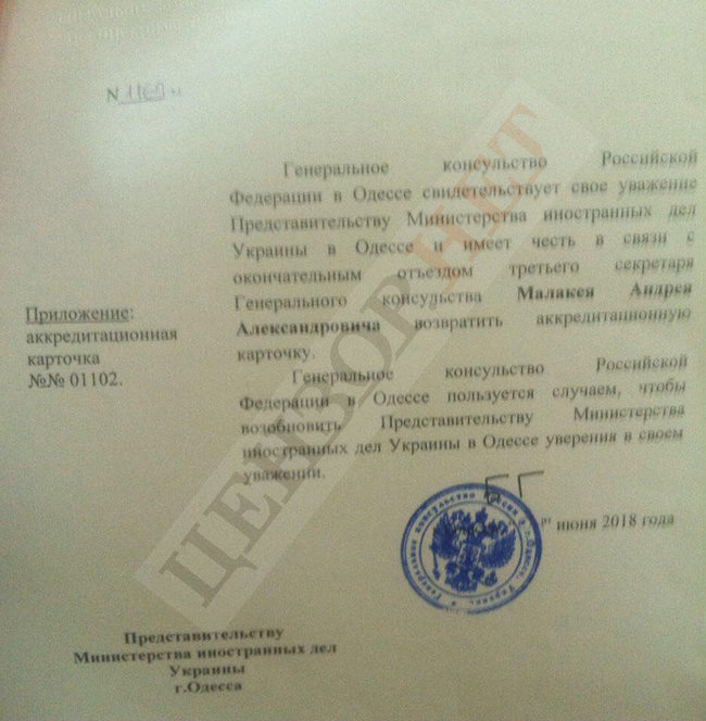 1 июня 2018 года во время прохождения багажного контроля российским дипломатом Малакеем в международном аэропорту "Одесса" возникло подозрение о нахождении в его портфеле запрещенных предметов. По итогам санкционированного дипломатом обыска был обнаружен похожий на сюрикен предмет.