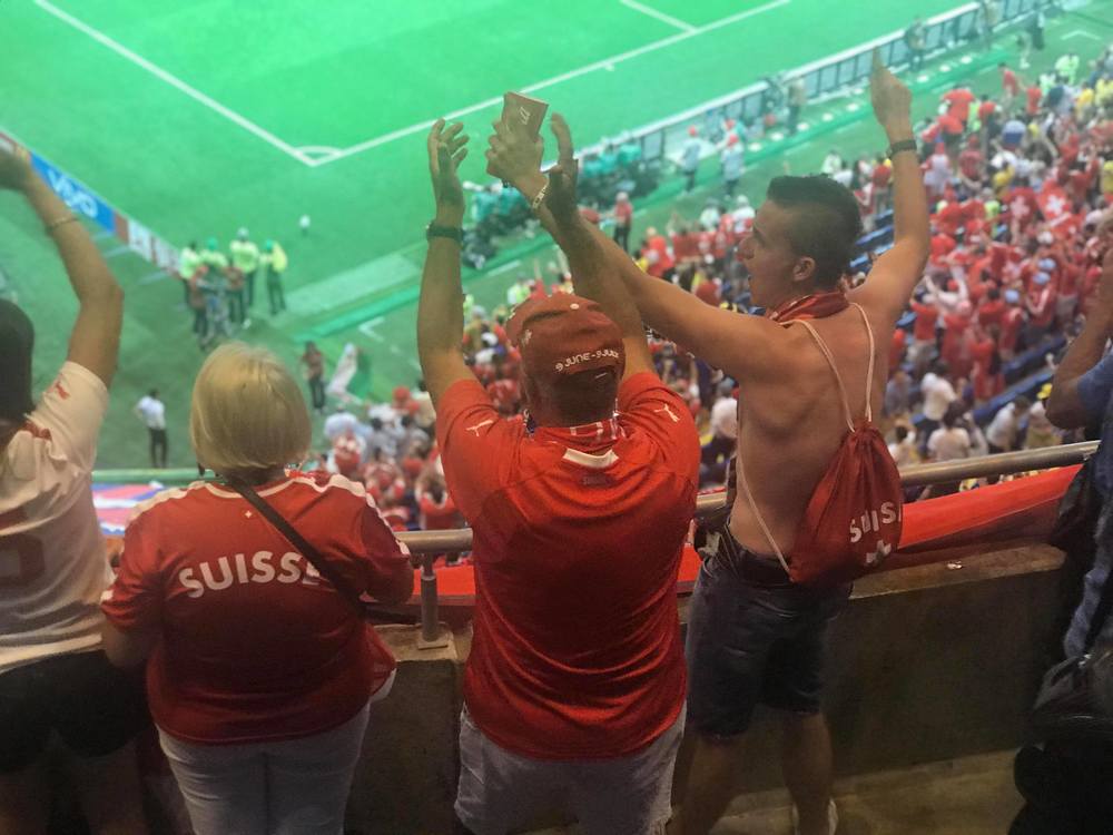 20.25 Полчаса до матча, ведущие развлекают фанатов и учат петь бразильскую песню на караоке, а болельщики сборной Швейцарии, которые движутся к стадиону, разминают глотки.