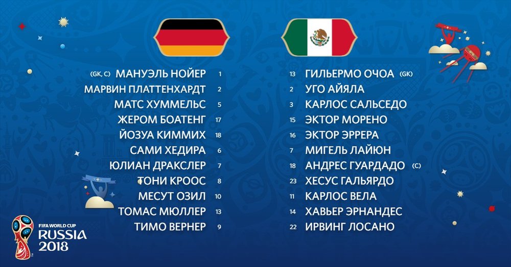 17.04 Стартовые составы сборных Германии и Мексики, которые сыграют в Лужниках.
