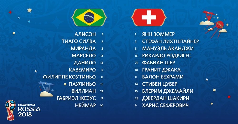 20.40 Составы играющих сегодня команд: сборной Бразилии и сборной Швейцарии