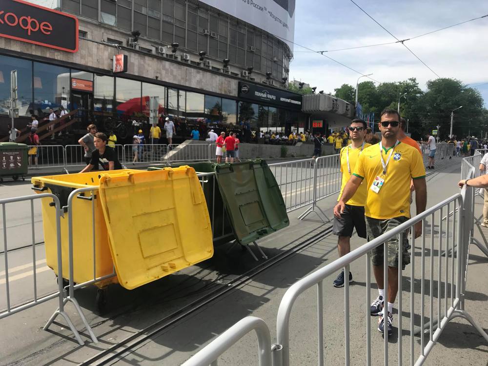 15:30 На улицах Ростова гуляют фанаты сборной Бразилии. С каждой минутой все больше бразильцев прибывают в фан-зону. Их явно больше, чем швейцарских болельщиков, которые недавно едва не заехали на территорию так называемой "ДНР", добираясь до стадиона в России.