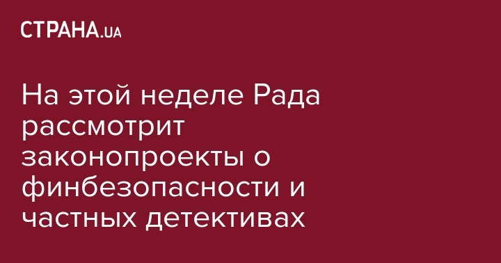 На пленарной неделе 19-22 июня в Верховной Раде планируют  рассмотреть законопроекты о Нацбюро финбезопасности, частной детективной деятельности и назначении судей Конституционного суда. Об этом сообщается на сайте парламента.
