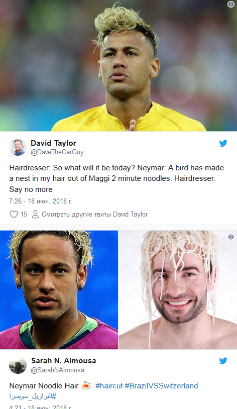 15.00 Пользователи соцсетей по всему миру вовсю издеваются над странной прической Неймара, которой он всех поразил в матче против Швейцарии. По словам самого игрока, это нечто он соорудил на своей голове на удачу.