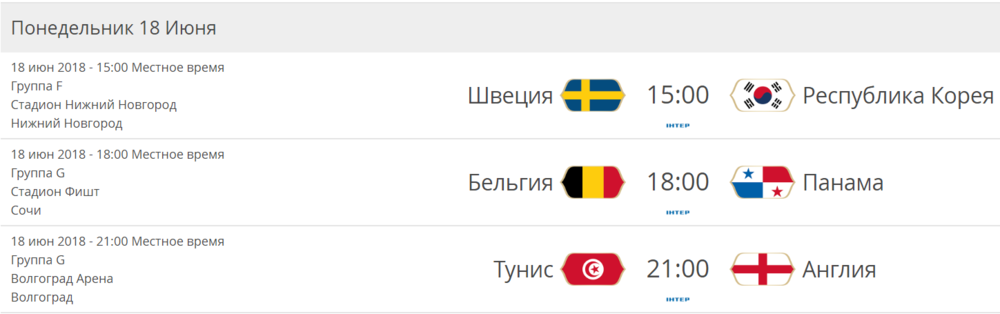 Мы сделали обзор всех событий 17 июня на Мундиале. Сегодня же расписание игр выглядит так: в 15.00 Швеция сыграла с Южной Кореей в Нижнем Новгороде - 1:0,  Бельгия сошлась с Панамой в Сочи, где выиграла 3:0. И закрыла этот день встреча Тунис - Англия в Волгограде, где сильнее были англичане, который в самой концовке добились победы - 2:1.
