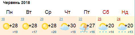 По данным сайта Sinoptik.ua, считает, что гроза будет в пятницу и субботу. Дневная температура +28...+29. В воскресенье столбик термометра днем опустится до +22.