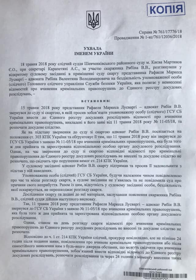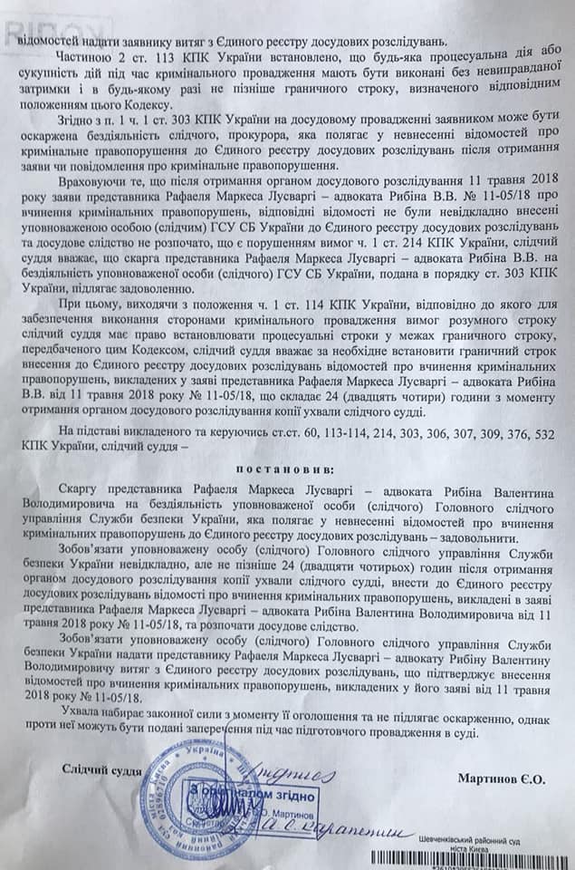 Таким образом, действия С14 - это по сути похищение человека. Однако дела на националистов тогда никто не завел. Адвокат Лусварги Валентин Рыбин подал на СБУ в суд, и тот обязал службу возбудить уголовное дело