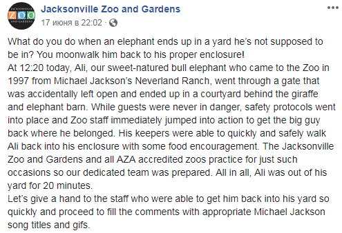 По словам сотрудников зоопарка, посетителям ничего не угрожало, потому что специалисты сразу же начали операцию по возвращению животного в загон. Али поманили едой, и он последовал за работниками зоопарка. Всего слон смог провести на воле не более 20 минут.