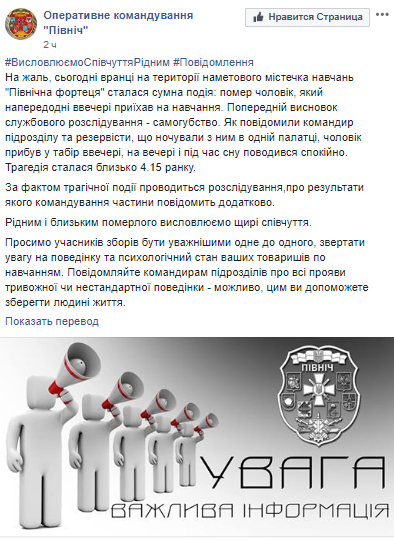 Во вторник, 19 июня, покончил с собой призванный на воинскую службу резервист. Трагедия произошла на территории палаточного городка военных учений "Северная крепость", которые проходят в Черниговской области. Об этом командование "Север" сообщает на своей странице в Facebook.