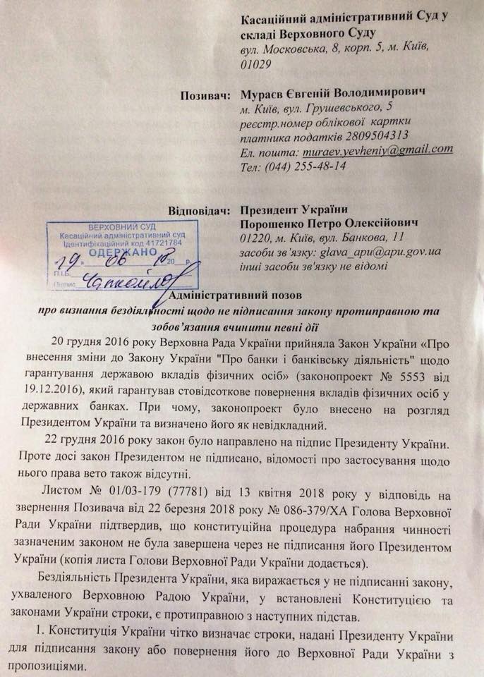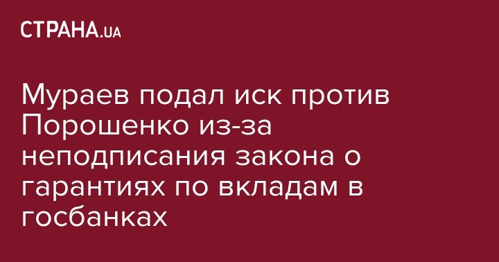 Мураев подал иск против Порошенко из-за неподписания закона о гарантиях по вкладам в госбанках