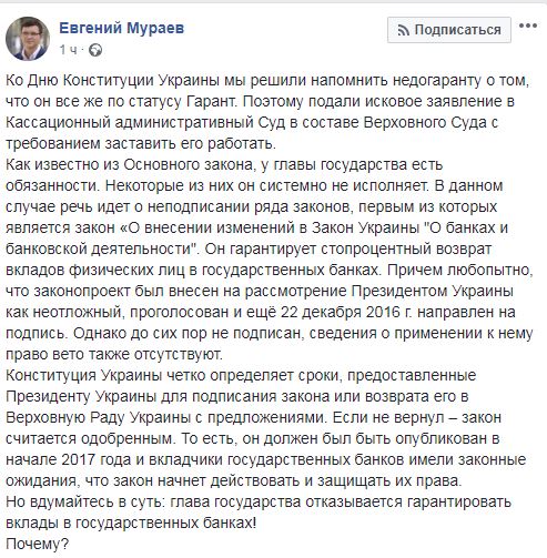 "Речь идет о неподписании ряда законов, первым из которых является закон "О внесении изменений в Закон Украины "О банках и банковской деятельности". Он гарантирует стопроцентный возврат вкладов физических лиц в государственных банках. Причем любопытно, что законопроект был внесен на рассмотрение Президентом Украины как неотложный, проголосован и еще 22 декабря 2016 г. направлен на подпись. Однако до сих пор не подписан, сведения о применении к нему право вето также отсутствуют", - пишет Мураев.