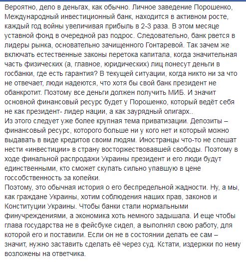 Он считает, что Порошенко тянет с этим документом из-за своей жадности. "Личное заведение Порошенко, Международный инвестиционный банк, находится в активном росте, каждый год войны увеличивая прибыль в 2-3 раза. В этом месяце уставной фонд в очередной раз подрос. Следовательно, банк рвется в лидеры рынка, основательно зачищенного Гонтаревой. Так зачем же включать естественные законы перетока капитала, когда значительная часть физических (а, главное, юридических) лиц понесут деньги в госбанки, где есть гарантия? В текущей ситуации, когда никто ни за что не отвечает, люди надеются, что хотя бы свой банк президент не обанкротит. Поэтому все деньги должен получить МИБ", - отмечает нардеп.