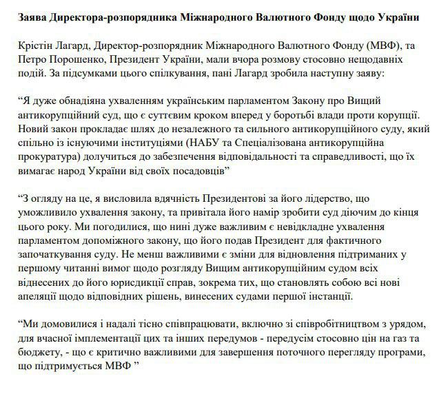"Принятие закона о Высшем антикоррупционном суде (ВАКС) является значимым шагом в борьбе с коррупцией, теперь важно оперативно учредить новый судебный орган и восстановить норму о его полномочиях", - отметила Лагард.
