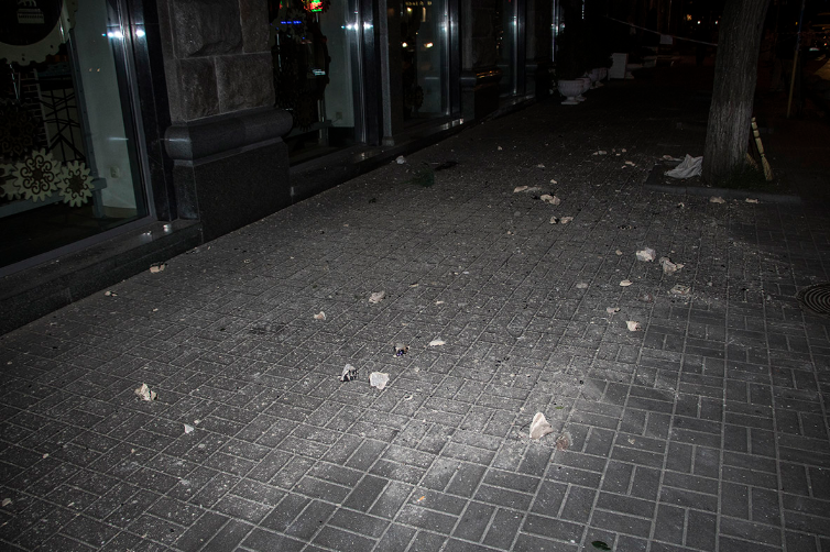 Инцидент произошел около 21:00 в доме №29. Обрушилась лепнина фасада. Куски бетона с четвертого этажа посыпались на тротуар и проезжую часть между магазином Roshen и вареничной "Катюша".